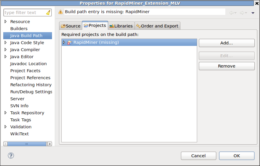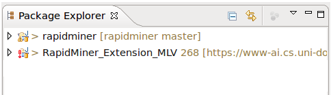 RapidMiner, dann auf Debug as und anschließend auf Debug configurations .. Java Applications und auf den New-Button. Dieser erzeugt eine Konfiguration, die nun noch angepasst werden muss. Für diese Konfiguration kann auch ein beliebiger Name gewählt werden.Main und unter Main class muss wieder com.rapidminer.gui.RapidMinerGUI angegeben werden.Arguments und dann unter VM arguments muss nun folgende Zeile eingetragen werden:-Drapidminer.operators.additional=resources/com/rapidminer/resources/OperatorsMLV.xmlClasspath auf User Entries klicken und dann auf den Add Projects..-Button, wo dann das Projekt mit der Extension hinzugefügt wird.